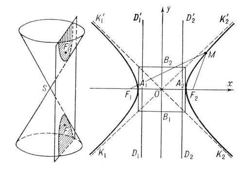 Гипе'рбола (греч. hyperbole), линия пересечения круглого конуса с плоскостью, встречающей обе его полости (рис. 1). Г. может быть также определена как геометрическое место точек М плоскости, разность расстоянии которых до двух определенных точек F1 и F2 (фокусов Г.) плоскости постоянна. Если выбрать систему координат хОу так, как указано на рис. 2 (OF1 = OF2 = с), то уравнение Г. примет вид: