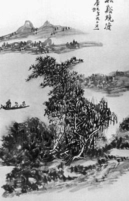 Хуан Бинь-хун. «Вечерняя переправа». Тушь, водяные краски. Мемориальный музей Хуан Бинь-хуна. Ханчжоу.