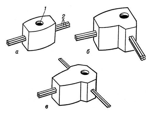 Подземные смотровые устройства К. к. связи (колодцы и коробки) подразделяются: по конструкции, размерам и соотношению размеров — на типовые и специальные; по конфигурации, связанной с направлением и количеством входящих в них пакетов (блоков) труб, — на проходные (рис. , а), угловые (рис. , б), разветвительные (рис. , в) и станционные; по материалу — на кирпичные и железобетонные, последние по способу изготовления — на сборные и монолитные; по расчетной нагрузке — для установки в пешеходной части (нагрузка от катка 20 км ) и в проезжей части (нагрузка от трейлера 300 кн ); по типоразмерам, в зависимости от количества каналов, вводимых со стороны станции, — на коробки малого и большого типов, колодцы малого, среднего, большого типов и станционные на 3000, 6000, 10 000 и 20 000 номеров; по форме — на прямоугольные, овальные, многогранные и эллипсовидные.
