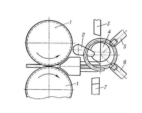 Схема навивки цилиндрических пружин с помощью подающих роликов и двух упорных штифтов на пружинонавивочном автомате: 1 — ролики, подающие проволоку; 2 — шаговая лапка; 3 — наружный нож; 4 — внутренний нож; 5 — наружный штифт; 6 — внутренний штифт; 7 — шаговый клин.