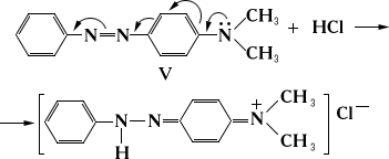 Перераспределение электронной плотности, особенно в момент реакции, происходит не только в связях, которые затрагиваются реакцией, но и в др. частях молекулы. Кажущаяся ненормальность солеобразования n– диметиламиноазобензола (V) с фиксацией протона слабоосновным атомом азота азогруппы объясняется перемещением реакционного центра молекулы вследствие сдвига электронной плотности в момент реакции в направлении, указанном стрелками:
