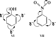 Взаимное влияние атомов в результате сопряжения связей проявляется также в ароматических соединениях (см. Ориентации правила). При электрофильном замещении электронодонорные (нуклеофильные) заместители (VI) ориентируют в орто- и пара– положения, электроноакцепторные (электрофильные) заместители (VII) — в мета– положение: