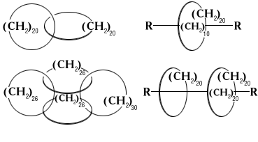 Синтезирован новый класс органических соединений, образованных сплетением двух или более циклических молекул подобно обычной цепи (катенаны, на схеме слева) или подобно гантели, на ось которой надето кольцо (ротаксаны, справа):