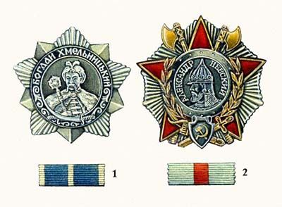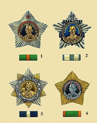 1. Орден Суворова 1-й степени. 2. Орден Ушакова 1-й степени. 3. Орден Богдана Хмельницкого 2-й степени. 4. Орден Суворова 2-й степени.