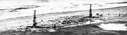 Сахалинская область. Буровые вышки на побережье Охотского моря.