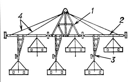 Рис. 1. Схема универсальной прицепной сцепки: 1 — сница; 2 — брус; 3 — удлинитель; 4 — растяжки.