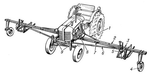 Рис. 2. Полунавесная сцепка: 1 — задняя растяжка; 2 — брус; 3 — каретка; 4 — опорное колесо; 5 — механизм навески; 6 — передняя растяжка; 7 — упорный транспортный ролик; 8 — установочный винт двухосного шарнира; 9 — рама.