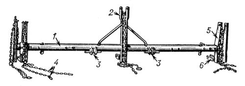 Рис. 3. Навесная сцепка (универсальная навеска): 1 — брус; 2 — стойка; 3 — палец подвески; 4 — цепи; 5 — кронштейн; 6 — тяга.