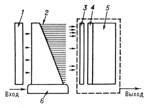 Блок-схема сцептрона: 1 — источник света; 2 — резонансная решётка из оптических волокон (стеклянных, кварцевых) разной длины (lb неск. см) и диаметра (lb 100 мкм), закрепленных с одной стороны на общем основании (в обойме); 3 — эталонная фотомаска (стеклянная пластинка с прозрачным или темповым узором — образом); 4 — матрица фотоэлементов; 5 — анализирующее и классифицирующее устройство; 6 — возбудитель решётки (электродинамический или пьезоэлектрический преобразователь электрических сигналов в механические колебания).