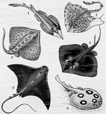 Скаты: 1 — рохля; 2 — морская лисица; 3 — звездчатый; 4 — морской кот (хвостокол); 5 — скат-орляк; 6 — электрический.