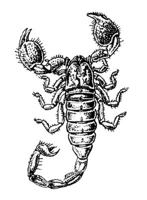 Скорпио'ны (Scorpionida), отряд беспозвоночных животных класса паукообразных . Тело длиной от 1 до 18 см, разделено на головогрудь и членистое брюшко, состоящее из двух отделов: широкого переднего и длинного, узкого заднего. Последний членик брюшка содержит 2 ядовитые железы, которые открываются на конце острого крючкообразного жала, служащего для защиты и нападения. Головогрудь несёт 3—6 пар глаз и 6 пар конечностей: маленькие хелицеры, большие ногощупальца (педипальпы) с клешнёй и 4 пары ног. Органы дыхания — лёгочные мешки, открывающиеся щелями на 3—6 сегментах брюшка. С. ведут ночной образ жизни. Питаются насекомыми, пауками, многоножками. Живородящи: в первые дни после рождения молодь сидит на матери. Около 500 видов; распространены в тропиках и субтропиках, как в пустынях, так и во влажных тропических лесах; в СССР—12 видов. Уколы С. очень болезненны для человека, а уколы крупных тропических С. могут оказаться смертельными.