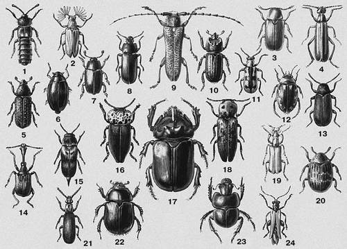 1. Алеохара двупятнистая (Aleochara bipustulata) — Европа, внетропическая Азия, Африка, Сев. Америка (США). 2. Веероус Шелковникова (Arrhaphipterus shelkovnikovi) — Европа (Кавказ). 3. Точильщик хлебный (Stegobium paniceum) — космополит. Вредитель хлебных и других продуктов, деревянных изделий. 4. Шпанка красноголовая (Epicauta erythrocephala) — Юго-Вост. Европа, Ср. Азия. 5. Лубоед большой сосновый, большой лесной садовник (Blastophagus piniperda) — Европа, Сев. и Вост. Азия. Вредитель сосны. 6. Вертячка желтоногая (Gyrinus natator) — Европа, Ср. и М. Азия, Сев. Африка. 7. Блестянка рапсовая, цветоед рапсовый (Meligethes aeneus) — Европа, внетропическая Азия, Сев. Африка, Сев. Америка. Вредитель цветков крестоцветных. 8. Хрущак мучной (Tenebrio molitor) — космополит. Вредитель зерна, муки, хлебных изделий. 9. Скрипун большой осиновый (Saperda carcharias) — Европа, Азия (Сибирь). Вредитель тополя и осины. 10. Рогачик однорогий (Sinodendron cylindricum) — Европа. Самец. 11. Трещалка спаржевая (Crioceris asparagi) — Ср. и Юж. Европа, М. Азия, Сев. Африка, Сев. Америка. Вредитель спаржи. 12. Гребец пёстрый (Platambus maculatus) — Европа, Азия (Сибирь, М. Азия). 13. Точильщик домовый (Anobium pertinax) — Европа, Азия (Сибирь). Вредитель деревянных строений. 14. Трубковёрт длинноголовый (Apoderus longiceps) — Азия (Д. Восток). 15. Шипоноска перевязанная (Mordella fasciata) — Европа, Азия (Сибирь). 16. Чернозлатка чёрная (Capnodis tenebrionis) — Ср. и Юж. Европа, Ср. и Передняя Азия, Сев. Африка. Вредитель плодовых деревьев. 17. Жук-носорог (Oryctes nasicornis) — Европа. Самец. 18. Щелкун глазчатый (Alaus pareyssii) — Вост. Средиземноморье. 19. Нарывник Стевена (Rhampholyssa steveni) — Ср. Азия. 20. Пилюльщик обыкновенный (Byrrhus pilula) — Европа, Азия (Сибирь). 21. Ризод бороздчатый (Rhysodes sulcatus) — Ср. и Юж. Европа, Азия (Зап. Сибирь, М. Азия). 22. Навозник обыкновенный (Geotrupes stercorarius) — Европа, Передняя Азия. 23. Кравчик головач (Lethrus apterus) — Юго-Вост. Европа. Вредитель полевых культур. Самец. 24. Узконадкрылка желтокрылая (Oedemera flavescens) — Европа.