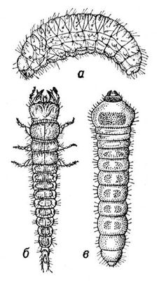 Рис. 6. Личинки жуков: а — долгоносика (эруковидная личинка); б — просяной жужелицы (камподеевидная личинка); в — мраморного скрипуна.
