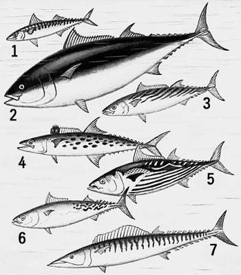 Скумбриевые: 1 — скумбрия; 2 — синеперый тунец; 3 — пеламида; 4 — королевская макрель; 5 — полосатый тунец; 6 — макрелевый тунец; 7 — ваху.