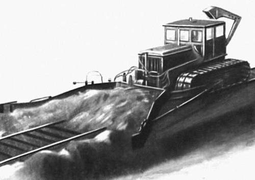 Тра'кторный дозиро'вщик , путевая машина для дозировки балласта в путь, засыпки шпальных ящиков и планировки балластной призмы при строительстве железных дорог, реже при ремонте эксплуатируемого железнодорожного пути. Оборудование Т. д. монтируется на гусеничном тракторе, приспособленном для передвижения по рельсовому пути и по грунтовым дорогам. Съёмное оборудование Т. д. (рис. ) — передний щит и шарнирно прикрепленные к нему 2 боковых крыла. Щит и крылья могут устанавливаться на разной высоте, благодаря чему изменяется толщина разравниваемого слоя. При работе крылья раскрываются под углом к направлению движения и удерживаются телескопическими распорками. Максимальная ширина захвата балласта крыльями 6,1 м . При движении машины балласт с обочины подаётся в путь. Рабочая скорость 2—4 км/ч .