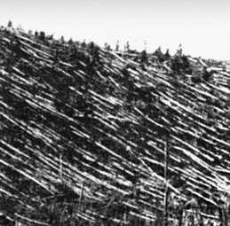 Рис. 1. Стволы деревьев, поваленных воздушной взрывной волной в районе падения Тунгусского метеорита.