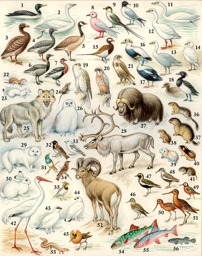 Тундровая фауна. 1. Белоклювая гагара. 2. Малый лебедь. 3. Гусь гуменник. 4. Белолобый гусь. 5. Канадская казарка. 6. Чёрная казарка. 7. Краснозобая казарка. 8. Розовая чайка. 9. Длиннохвостый поморник. 10. Вилохвостая чайка. 11. Американский лебедь. 12. Белый гусь. 13. Голубой гусь. 14. Малый белый гусь. 15. Морянка. 16. Очковая гага. 17. Гага гребенушка. 18. Хохлатая чернеть, самец и самка. 19. Кречет. 20. Сапсан. 21. Мохноногий канюк. 22. Ласка. 23. Горностай. 24. Землеройка-бурозубка. 25. Волк. 26. Белая сова. 27. Овцебык. 28. Северный олень. 29. Песец. 30. Заяц-беляк. 31. Варакушка. 32. Лапландский подорожник . 33. Пуночка. 34. Краснозобый конёк. 35. Рогатый жаворонок. 36. Длиннохвостый суслик. 37. Чёрношапочный сурок. 38. Сибирский лемминг. 39. Копытный лемминг. 40. Норвежский лемминг. 41. Полёвка Миддендорфа. 42. Журавль стерх. 43. Тундреная куропатка. 44. Белая куропатка. 45—51. Кулики: 45 — турухтан; 46 — песочник; 47 — золотистая ржанка; 48 — чернозобик; 49 — плосконосый плавунчик; 50 — малый веретенник; 51 — бекасовидный веретенник. 52. Снежный баран. 53. Углозуб. 54. Мальма. 55. Арктический голец. 56. Даллия.