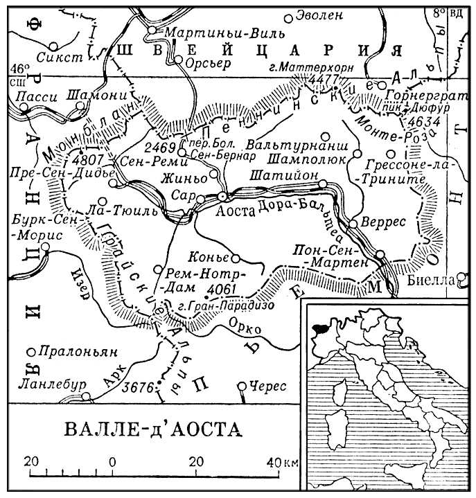 Ва'лле-д'Ао'ста (Valle d'Aosta), автономная область Италии, наименьшая по территории и числу жителей в стране. Площадь 3262 км2 . Население 107,9 тыс. чел. (1968); говорит на итальянском и французском языках, в районе Монте-Роза — на немецких диалектах. Главный город Аоста (35,3 тысяч жителей). Расположена на С.-З. страны, в Альпах. Занимает долину Валле-д'Аоста и частично Пеннинские Альпы на С., Монблан на С.-З. (высота до 4807 м ) и Грайские Альпы на Ю.-З. Густая сеть рек. Характерны горно-лесные и горно-луговые ландшафты, ледники. В промышленности занято свыше 40% экономически активного населения (1965). Основная отрасль сельского хозяйства — молочное животноводство. Сыроварение, производство масла. Луга и пастбища занимают 46% всех с.-х. земель. Небольшая площадь под зерновыми, картофелем, садами (яблони и груши), виноградниками. Туризм и горнолыжный спорт. Добыча железной руды (Конье), антрацита (Ла-Тюиль), мрамора (Шатийон). Общая мощность ГЭС 900 Мвт (900 тыс. квт ). Электрометаллургия (Аоста, Пон-Сен-Мартен), производство искусственных и синтетических тканей (Шатийон), мясо- и плодоконсервные, пивоваренные предприятия.