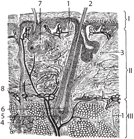 Рис. 8. Схематическое изображение строения кожи: 1 – нервные рецепторы; 2 – волос; 3 – мышца, поднимающая волос; 4 – потовая железа; 5 – волосяной сосочек; 6 – волосяная луковица; 7 – сальная железа; 8 – кровеносные сосуды