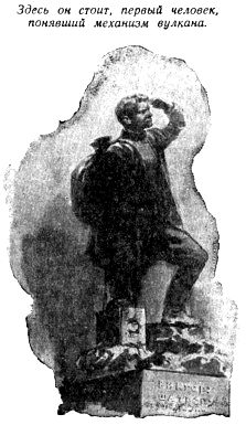 В самом центре Вулканограда, на полукруглой площади перед воротами завода стоит величественная фигура из литого базальта. Она изображает юношу, он остановился в пути, на спине его висит вещевой мешок, у ног стоит аппарат, тускло поблескивает кристалл горного хрусталя, изображающий экран. Левой рукой юноша придерживает аппарат за ремни и, заслонившись правой от солнца, смотрит на вершину Горелой сопки. Юноша шел долго и устал. Ему жарко, он сбросил шапку на землю, его кудрявые волосы прилипли ко лбу. Рот полуоткрыт — путник еще не перевел дыхания, но уже заметна улыбка, наконец-то он видит вулкан, наконец-то он у цели. На пьедестале надписано золотыми буквами: