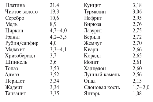 Твердость необработанных камней, упомянутых в данном издании, по шкале Мооса (твердость — это устойчивость материала к царапинам и потертостям):