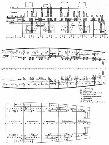На “Блюхере” согласно источнику [10], оборудовали 10 верхних угольных ям на броневой палубе и 16 защитных. В пяти КО побортно расположили 10 расходных угольных ям. В октябре 1909 г. на Государственной верфи в Киле произвели пробное заполнение угольных ям. Верхние угольные ямы вместили 1072 т угля, расходные 475 т, защитные 961, всего 2508 т; Groner [7], нормальный запас угля составлял 900 т, полный 2510 т; Conway [6], 2260 т.