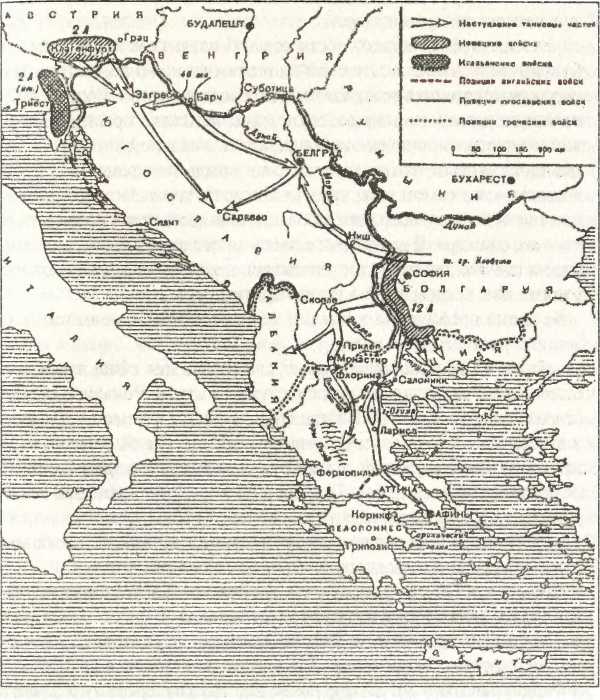 Разработанный германским командованием план вторжения был следующим. 2-я армия должна была наступать на Загреб, а оттуда через горы Боснии и Герцеговины — в направлении на Сараево; одновременно ударная танковая группа должна была прорваться на Белград через венгерскую границу. Бгавный удар намечался из Болгарии, где сосредоточилась наша 12-я армия и танковая группа Клейста. Клейст должен был наступать через Ниш на Белград с юга, в то время как 12-я армия одновременно вступала в Северную Грецию и Южную Сербию. Поскольку развертывание 2-й армии еще не было закончено, 12-я армия начала действия 6 апреля, а 8-го началось наше наступление с севера.