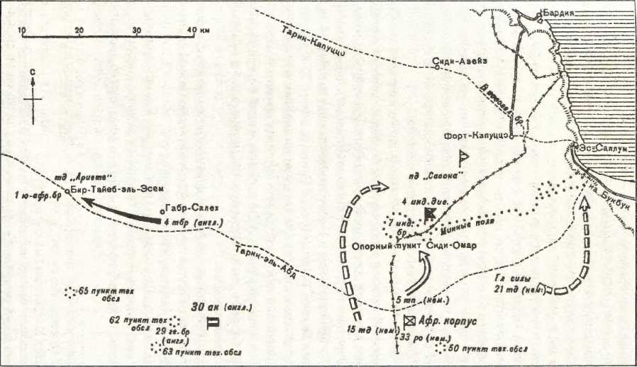 где и находилась под защитой наших собственных минных полей. В ночь с 24 на 25 ноября Роммель и Крювель с сопровождавшими их офицерами безнадежно заблудились на египетской стороне за проволочными заграждениями и вынуждены были сделать привал в районе, где располагались огневые позиции английской артиллерии и через который шли войска. Только чудом им удалось ускользнуть, а утром 25 ноября Роммель, не имея достаточных сведений о расположении противника, принял слишком поспешное решение, 5-й танковый полк был брошен на Сиди-Омар и потерял половину своего состава в безрезультатных атаках против 7-й индийской бригады, поддерживаемой 1-м и 25-м полками полевой артиллерии. Остальные части 21-й танковой дивизии блуждали южнее прохода Хальфайя, нигде не встречая противника, 15-я танковая дивизия образовала заслон западнее эс-саллумских позиций и во второй половине дня уничтожила мастерские 1-й армейской танковой бригады. Итальянская дивизия «Ариете» была задержана 1-й южноафриканской бригадой и 4-й английской бронетанковой бригадой около Бир-Тайеб-эль-Эсем и не смогла выйти к границе, как ей было приказано1. Весь день Африканский корпус подвергался непрерывным воздушным атакам, которые причинили ему серьезные потери, тем более что эс-саллумский участок фронта был вне досягаемости наших истребителей. Короче говоря, 25 ноября было для нас очень неудачным днем: мы понесли тяжелые потери, добившись лишь ничтожных результатов.