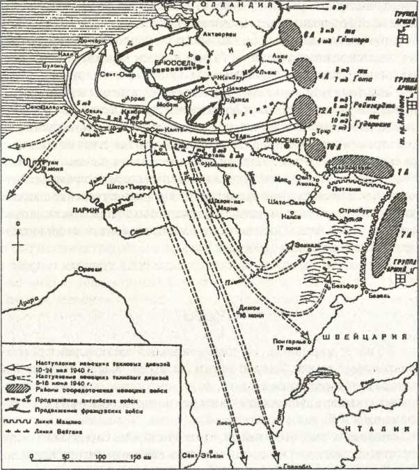 В 5 час 35 мин 10 мая 1940 года авангарды немецких войск перешли границы Бельгии, Люксембурга и Голландии. Как и в Польше, мы обладали господством в воздухе, но не предпринимали никаких попыток помешать движению английских и французских войск, устремившихся в Бельгию и Южную Голландию. Германское верховное командование радо было видеть, что его ожидания оправдались и что противник реагирует на наше наступление именно так, как нам было нужно.
