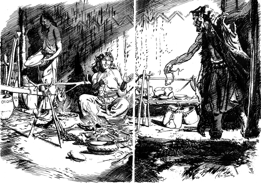 Шаман, обутый в кожаные постолы [7] , прыгнул в очаг и принялся затаптывать пламя. При этом Кривой Рот растоптал и две красивые глиняные миски, стоявшие возле очага. Потом, кипя от гнева, вылетел из хижины и скрылся в лесу.