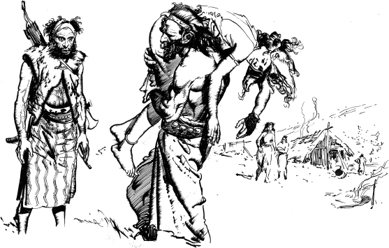 Мужчина и две женщины, таясь за кустами, подкрались к ней. Внезапно мужчина вскочил, обхватил Кудряшку сзади, отбросив прочь ее горшок для воды так, что тот раскололся, перекинул ее через плечо и поволок в поселок.
