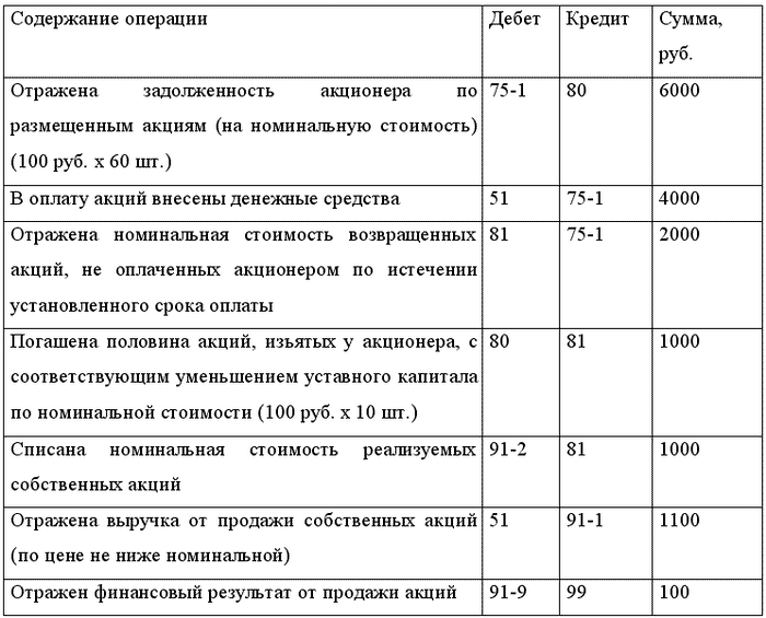 Пример.При учреждении акционерного общества учредитель подписался на 60 акций номинальной стоимостью 100 руб. В течение установленного срока акционер фактически оплатил 40 акций (внес 4000 руб.). Неоплаченными остались 20 акций на общую сумму 2000 руб. по номинальной стоимости. Акции были изъяты у акционера: 10 изъятых акций погашены, а остальные реализованы по цене 110 руб.