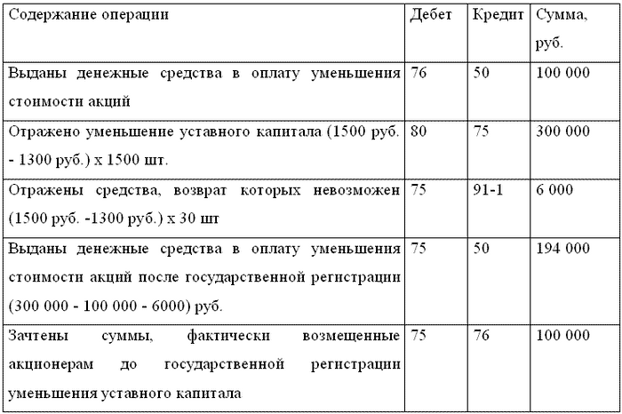 Пример. Собрание акционеров ОАО приняло решение об уменьшении номинальной стоимости акций, размещенных среди акционеров, с 1500 руб. до 1300 руб. за одну акцию. Общее количество акций – 1500. Соответствующие изменения были внесены в устав ОАО и зарегистрированы в установленном законом порядке. Уменьшение номинальной стоимости акций оплачено акционерам-держателям наличными денежными средствами. При этом одному из акционеров, являющемуся юридическим лицом и которому принадлежало 30 акций, возврат средств не был осуществлен по причине его ликвидации.