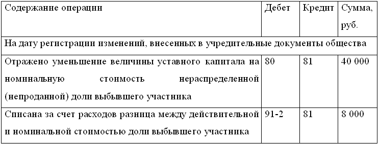 Если доля выбывшего участника в течение одного года со дня ее перехода к обществу не распределена между участниками общества или не продана участникам (третьим лицам), то необходимо будет уменьшить уставный капитал общества на стоимость вышеуказанной доли.