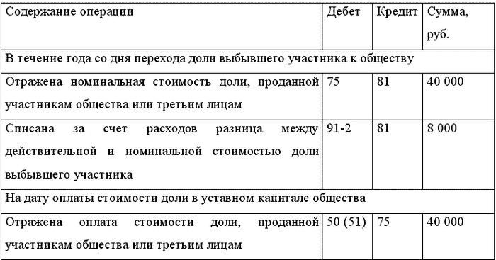 Если доля выбывшего участника в течение года будет реализована, то бухгалтерские записи будут следующими: