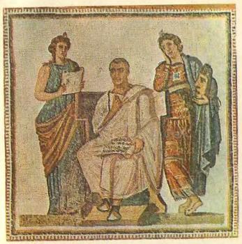 По сторонам поэта стоят две музы. Та, что за правым плечом, держит свиток, другая, со скорбным лицом и театральной маской в левой руке, пригорюнилась, облокотившись на спинку кресла, где сидит поэт. Никакой иной музой она не может быть, кроме Мельпомены. Нас не должно удивлять ее присутствие рядом с поэтом, не сочинявшим драматических произведений: Гораций, тоже не бывший драматургом, упоминает в последнем стихе своего знаменитого «Памятника» именно Мельпомену и призывает ее гордиться заслуженной славой.