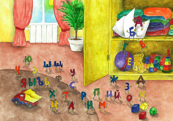 Букварь открылся, буквы высыпались на пол и разбежались кто куда.