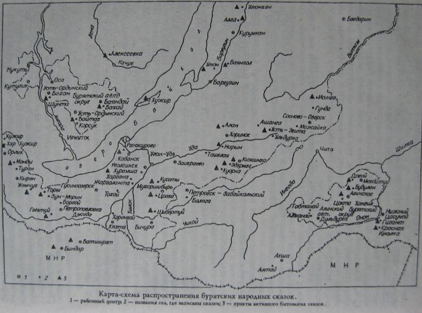 Деление бурятской сказочной традиции на три зональные группы (бурят забайкальских, прибайкальских и проживающих в Монголии) условное, так как в репертуаре всех зон содержится значительный слой общебурятских сюжетов и мотивов.
