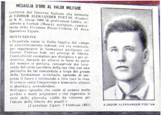 Указ итальянского правительства о награждении Федора Поетана Золотой медалью и портрет героя.