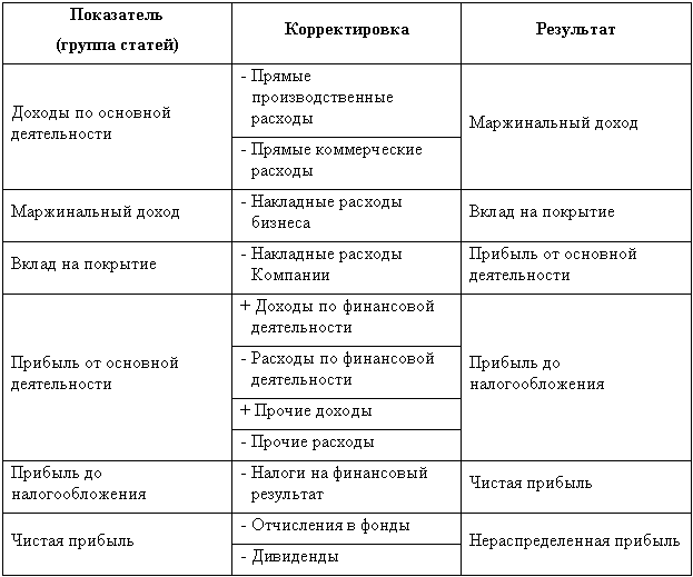 Формат Бюджета Доходов и Расходов (последовательность и группировка статей) должен соответствовать принятому на предприятии формату Отчета о Прибылях и Убытках (ОПУ), так как только такое соответствие позволит качественно спланировать и учесть весь процесс формирования финансовых результатов деятельности предприятия. БДР (аналогично ОПУ) предполагает последовательное вычитание из валовых финансовых результатов (выручка, маржинальный доход и т.д.) соответствующих расходных статей, из чего формируются “очищенные” от этих расходов финансовые результаты (вплоть до чистой и нераспределенной прибыли). Пример последовательного формирования финансовых результатов представлен на Таблице 4.