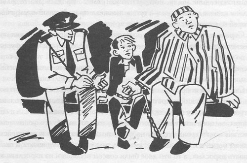 То есть это были настоящие полицейский и арестованный. Полицейский — низенький, тощий и смотрит нервно так. Арестованный повыше него и упитанный. Увидел меня, заухмылялся во весь рот и говорит: «Привет, сынок! Едешь навестить свою бабушку?»