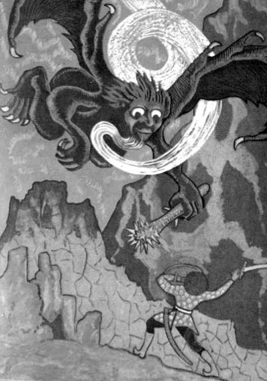 Она помчалась в горы, схватила огромный камень и хотела бросить его на спящего, но птенцы Сумруг выпрыгнули из гнезда и