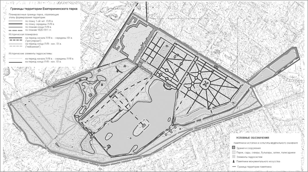 Историко-архитектурный опорный план территории Екатерининского дворца и парка. Сост. Г.В. Семенова, Т.В. Степанова. 1996-2001 гг.