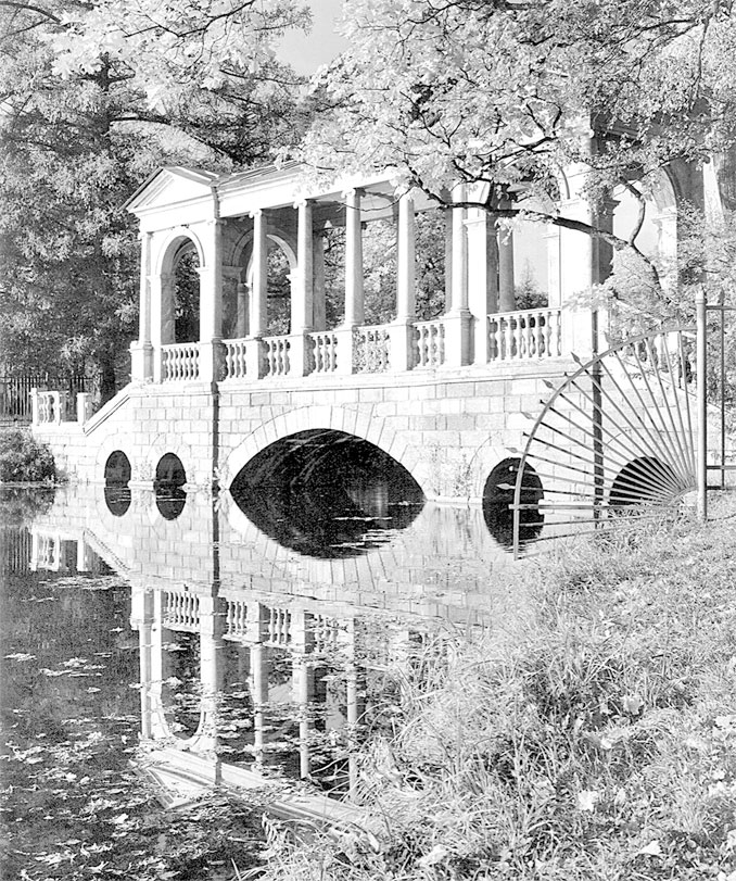 Осуществление широкой программы садово-парковых работ началось с создания Верхних прудов – «прудков с лебедиными островками и канальцами» по проекту В.И. Неелова. Берега Большого пруда получили плавные очертания естественного озера. Они охватили сразу же всю территорию будущего парка – от Подкапризовой дороги до Гатчинских Орловских ворот и Нижних прудов. Одним из лучших произведений зодчего является Палладиев Сибирский мост, или, по первоначальному названию, «Сибирская мраморная галерея», гармонично включенный в пейзажи Большого и Верхних прудов. К изготовлению блоков мраморного моста по модели и проекту В.И. Неелова приступили в 1770 г. на гранильном заводе в Екатеринбурге. Сама галерея с колоннами ионического ордера, лестницами и балюстрадой целиком сооружена из уральского мрамора разных цветов – горношитского голубовато-серого, становского белого, устои и пятиарочный мост – из серовато-розового гранита. Композиция восходит к известному проекту А. Палладио, впервые примененному в парках Англии – в Кью, Стоу, Басе, Чатсворте. Неелов был автором возведенной в 1770–1773 гг. Пирамиды первого павильона, послужившего образцом для подобных сооружений пейзажных парков в России. Павильоны в виде пирамиды – древнейшего символа вечности – были распространены в пейзажных европейских парках. Четыре мраморные колонны по ее сторонам установлены в 1773 г. Впоследствии пирамиду разобрали и отстроили заново по проекту архитектора Ч. Камерона. Считалось, что в художественной композиции царскосельской пирамиды использованы мотивы пирамиды Цестия в Риме (надгробный памятник I в. до н. э.), однако ее называли и Китайской, и Египетской.
