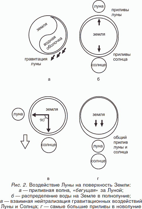 Первый эффект влияния Луны на Землю – гравитационный. Луна делает полный оборот вокруг Земли за 24 часа 50 минут. Под действием притяжения Луны твердая поверхность Земли деформируется, растягивается по направлению к Луне на величину около 50 см в вертикальном направлении и около 5 см в горизонтальном. Естественно, еще сильнее это влияние сказывается на водной оболочке Земли, вызывая приливы и отливы. В результате этого в течение суток через равные промежутки времени наблюдаются две полные и две малые волны, примерно равные по высоте, а также одна полная и одна малая волна, если не считать смешанных. Таким образом, явление приливов и отливов выражается в том, что в береговых зонах океана вода через каждые 12 часов 25 минут начинает прибывать, образуя приливную волну. Это возмущающее гравитационное воздействие, естественно, сказывается на поведении атмосферы, что, в свою очередь, влияет на многие метеорологические явления.