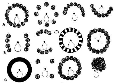Продолжение опытов Тинбергена. Слева — вход в нору филанта окружен кольцом из сосновых шишек: филант безошибочно приземляется в центр кольца; кольцо из шишек перемещено чуть о сторону от хода (он виден слева а углу, и оса опускается по-прежнему в центр кольца, то есть на неверное место… Справа — филант приучен летать в центр круга и продолжает это делать, хотя теперь круг выложен не из шишек, а из камешков, да еще на неверном месте, а ход в гнездо обрамлен треугольником из сосновых шишек.