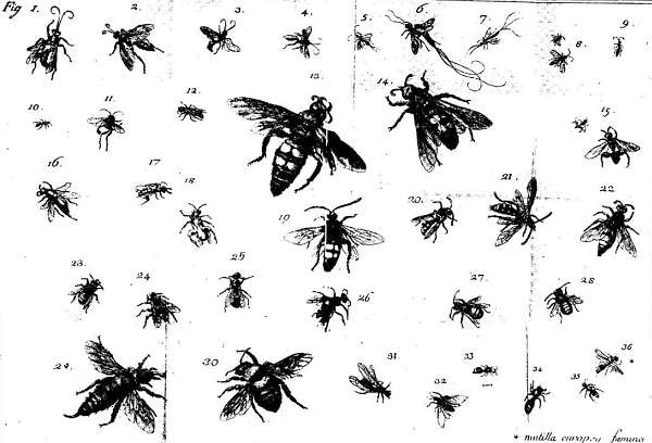 Изображение перепончатокрылых на таблице, приложенной к старинному изданию книги Карла Линнея, — здесь и наездники, и осы, и пчелы, и шмели…