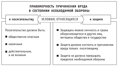 Как видно из представленной схемы, условия правомерности причинения вреда в состоянии необходимой обороны могут относиться к посягательству и защите. Рассмотрим их более подробно.