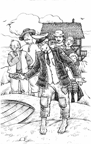 На голове – новая морская, синяя с белым верхом, фуражка с шитым золотым якорем; на плечах – щегольской яхт-клубский синий пиджак с черным галстуком. Лучше и быть не может. А на ногах… короткие, доходящие до икр покоробленные дудки, испещренные квадратными заплатами, словно политическая карта Северо-Американских Штатов… И босые, огромные ступни с оттопыренным большим пальцем, совсем такие, как у одного из братьев Фрателлини в цирке…