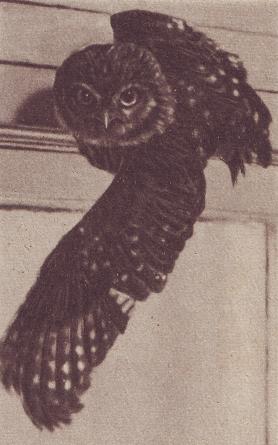Привезенный с Украины домовый сыч Миша тоже выкормыш. У сов замечательный слух, и Миша убедительно доказал это. По ночам ему нравится гулять по комнате. Летает он, как и его родственники, бесшумно, а когда бегает по полу, то топочет не хуже ежа. Он всем интересуется, все исследует. Заглядывает под дверь, во все укромные уголки.
